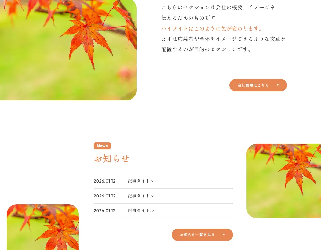 サンプル画像をご覧いただくと分かる通り、フォント・余白・配色・角丸の違いだけでも、サイトの印象は大きく変わります。 もともとはゼロからデザインしたWebサイトをベースにしているため、いわゆる「テンプレート感」はありません。